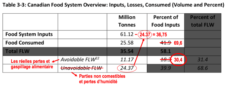Si le poids des parties non comestibles et des pertes d’humidité était minime ou impossible à quantifier, il serait compréhensible de ne pas les exclure, mais c’est loin d’être le cas ici : elles représenteraient 40% du poids total des matières premières alimentaires! Ainsi, lorsqu’on les exclut du portrait comme il se doit, on obtient plutôt 30,4 % d’aliments perdus ou gaspillés au Canada, ce qui est beaucoup plus réaliste comme chiffre si l’on compare avec les estimations précédentes pour le Canada ou d’autres pays. Et ça reste tout à fait terrible comme proportion, pratiquement un aliment sur trois!